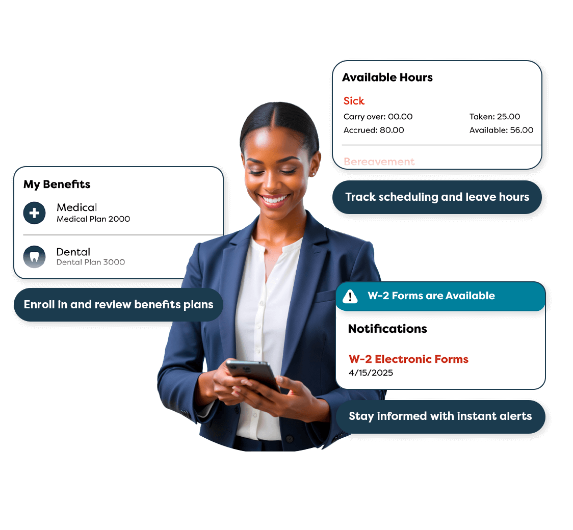 - Online benefits enrollment and PTO tracking